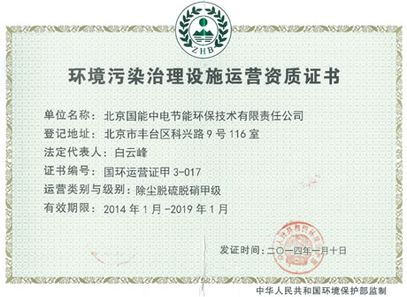 當(dāng)前位置: 國能中電公司動態(tài)> 我司喜獲環(huán)保部《環(huán)境污染治理設(shè)施運營資質(zhì)甲級證書》