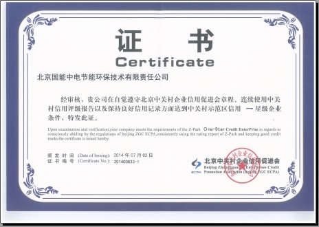 2014年7月2日,我公司榮獲”中關村示范區信用一星級企業證書”。該證書證明我公司在信用度方面贏得中關村管委會及中國人民銀行的認可,企業融資能力不斷攀升。
